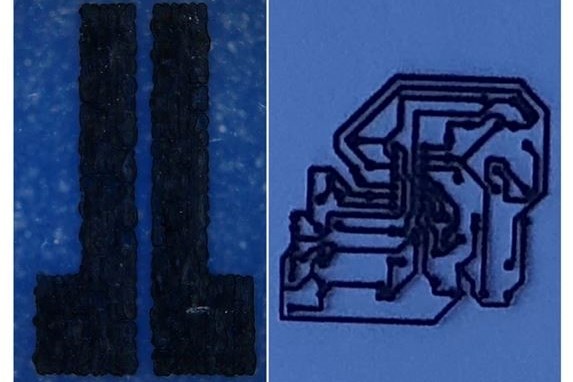 Optical image inkjet-printed transistor contacts (left) and interconnect (right). The scale bar is 100 micrometers (left) and 1 centimeter (right). Photo Credit, all images: “Cyclic production of biocompatible few-layer graphene ink with in-line shear-mixing for inkjet-printed electrodes and Li-ion energy storage”